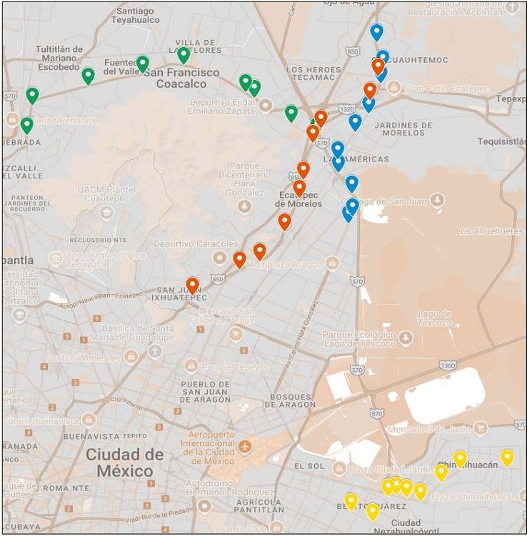 En la Línea 3 están en Bordo de Xochiaca, Torres Guerrero, Chimalli, Palacio Municipal, Acuitlalpilco, Santa Elena, La Presa, General Vicente Villada y Rancho Grande.