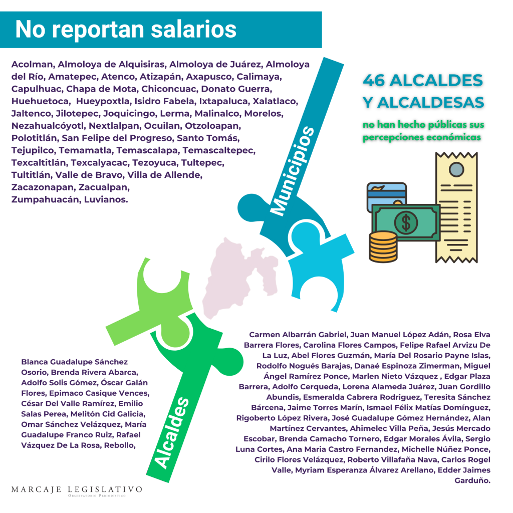 A menos de tres meses de que finalice el año, 46 alcaldes y alcaldesas no han hecho públicas sus percepciones económicas, con lo que incumplen la Ley de Transparencia y Acceso a la Información Pública del Estado de México y Municipios, que establece la obligación de dar a conocer la remuneración bruta y neta de todos los servidores públicos de base o de confianza.