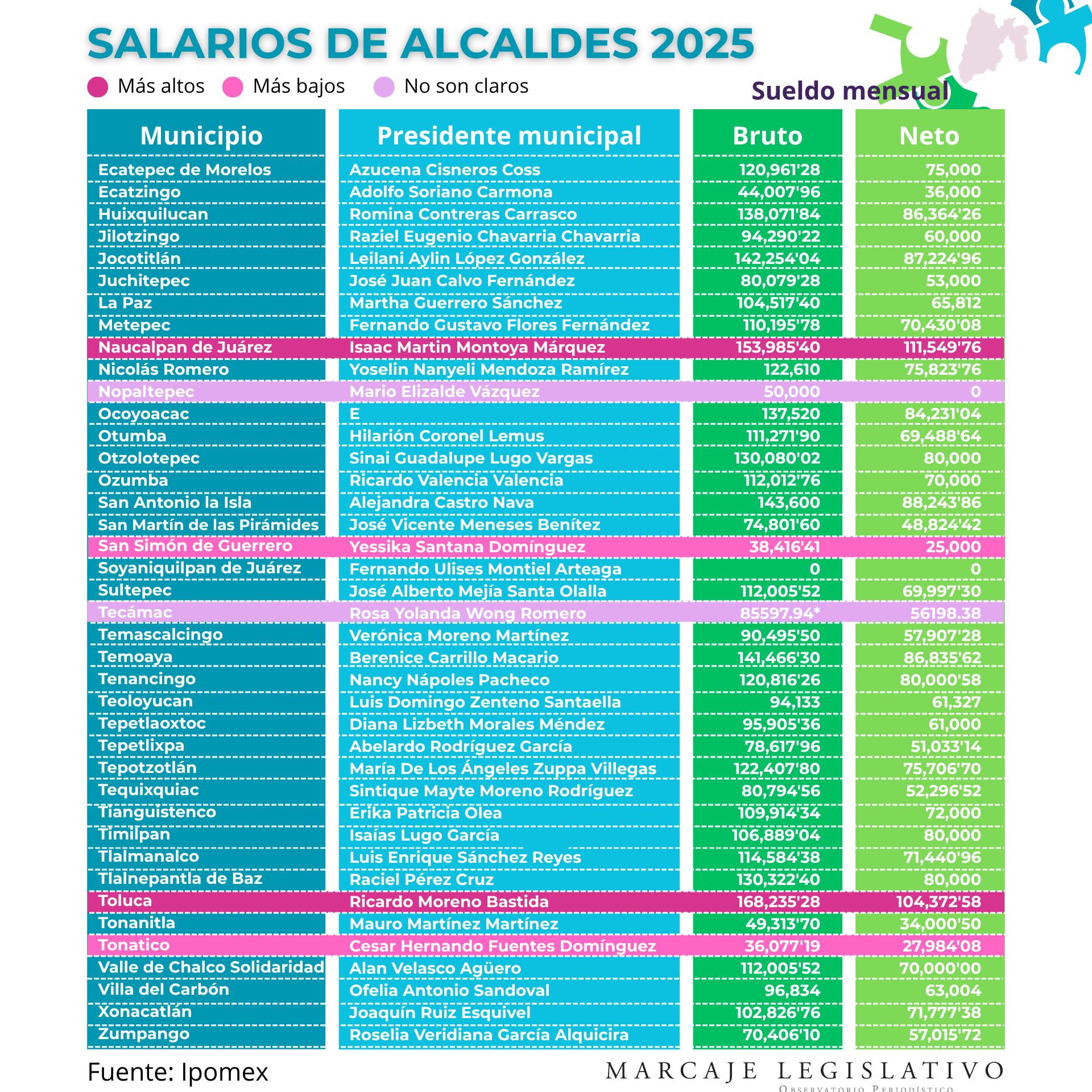 Otros dos no son claros con las cifras que presentan; el de Nopaltepec no ha transparentado su remuneración neta, y la de Tecámac presenta el mismo salario que los regidores.