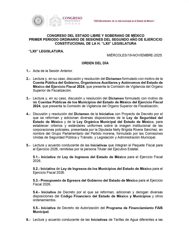Este miércoles el Congreso del Estado de México aprobará los dictámenes de las Cuentas Públicas estatal y municipales del ejercicio fiscal 2024 y recibirán, entre otras cosas, las iniciativas que integran la propuesta de Paquete Fiscal para el ejercicio 2026, remitidas por la gobernadora de la entidad, Delfina Gómez Álvarez.
