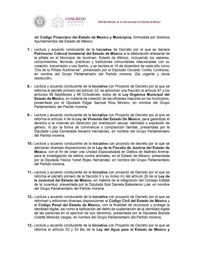 El grupo parlamentario de morena propondrá declarar patrimonio cultural inmaterial del Estado de México la elaboración artesanal de la piñata en el municipio de Acolman, incluyendo los saberes, conocimientos, técnicas, prácticas y tradiciones comunitarias relacionadas con su creación, transmisión y uso festivo y declarar el 16 de diciembre de cada año como “Día de la Piñata Acolmense. Se prevé votar ese punto por urgente y resolución.