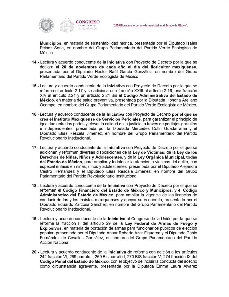 El Partido Verde impulsará ajustes a la Ley del Agua estatal, en materia de sustentabilidad hídrica, otra iniciativa para declarar el 20 de noviembre de cada año como el Día del Floricultor Mexiquense y una más para hacer cambios al Código Administrativo estatal, en materia de salud preventiva.