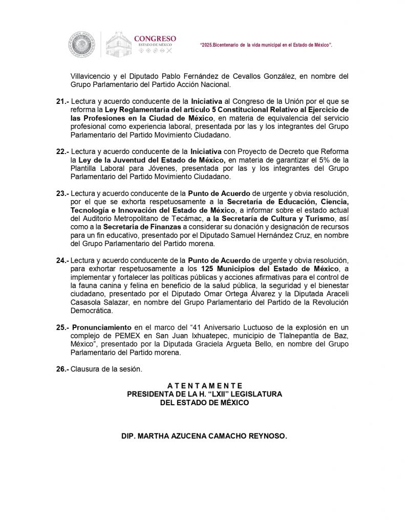 En cuanto a los puntos de acuerdo, morena buscará exhortar a la Secretaría de Educación a informar sobre el estado del Auditorio Metropolitano de Tecámac y a las secretarías de Cultura y de Finanzas a considerar su donación y asignación de recursos para un fin educativo.