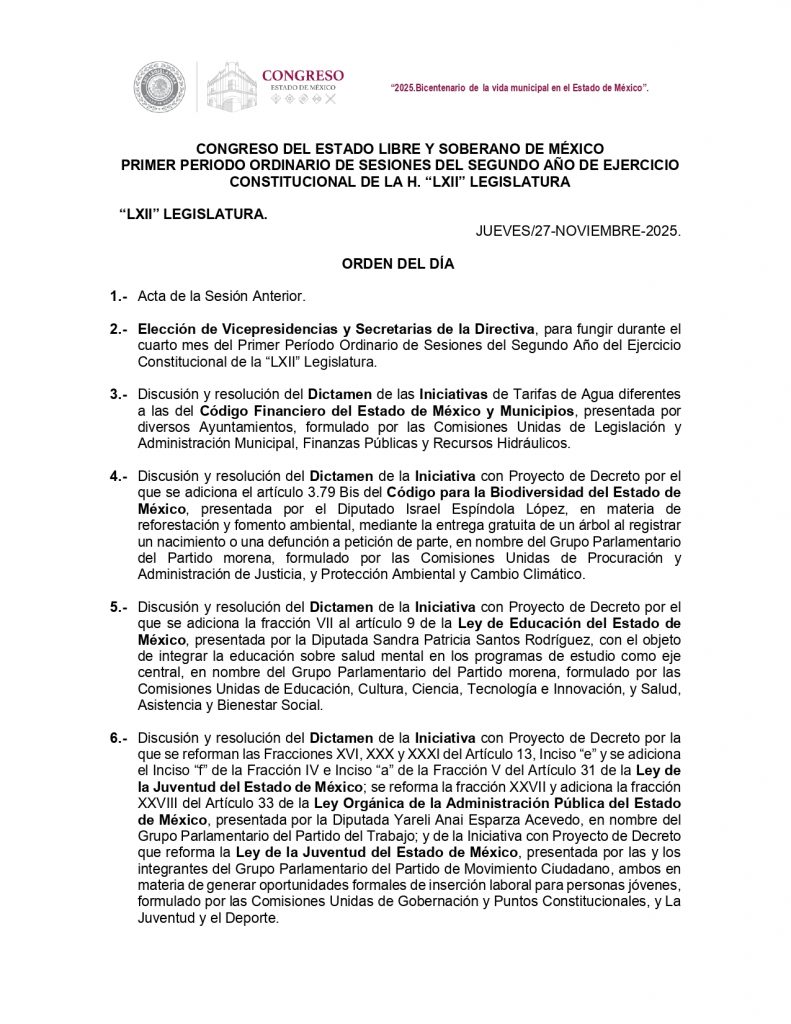 Este jueves el Congreso del Estado de México sesionará para aprobar algunos dictámenes, entre ellos, las tarifas de agua diferentes a las del Código Financiero, presentadas por los ayuntamientos, y recibirá diversas iniciativas, tanto del Ejecutivo, como de los distintos grupos parlamentarios.