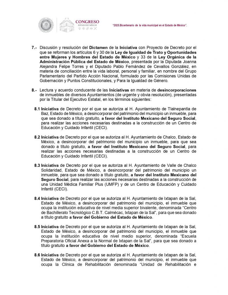 De los inmuebles que se desincorporarán dos serían donados al IMSS, a fin de realizar las acciones necesarias para la construcción de un Centro de Educación y Cuidado Infantil en Tlalnepantla y en Chalco, otro también al IMSS para construir una Unidad Médica Familiar Plus y un Centro de Educación y Cuidado Infantil y otros dos en Ixtapan de la Sal, que actualmente se ocupan para instituciones educativas, para donarlos al Gobierno del Estado.
