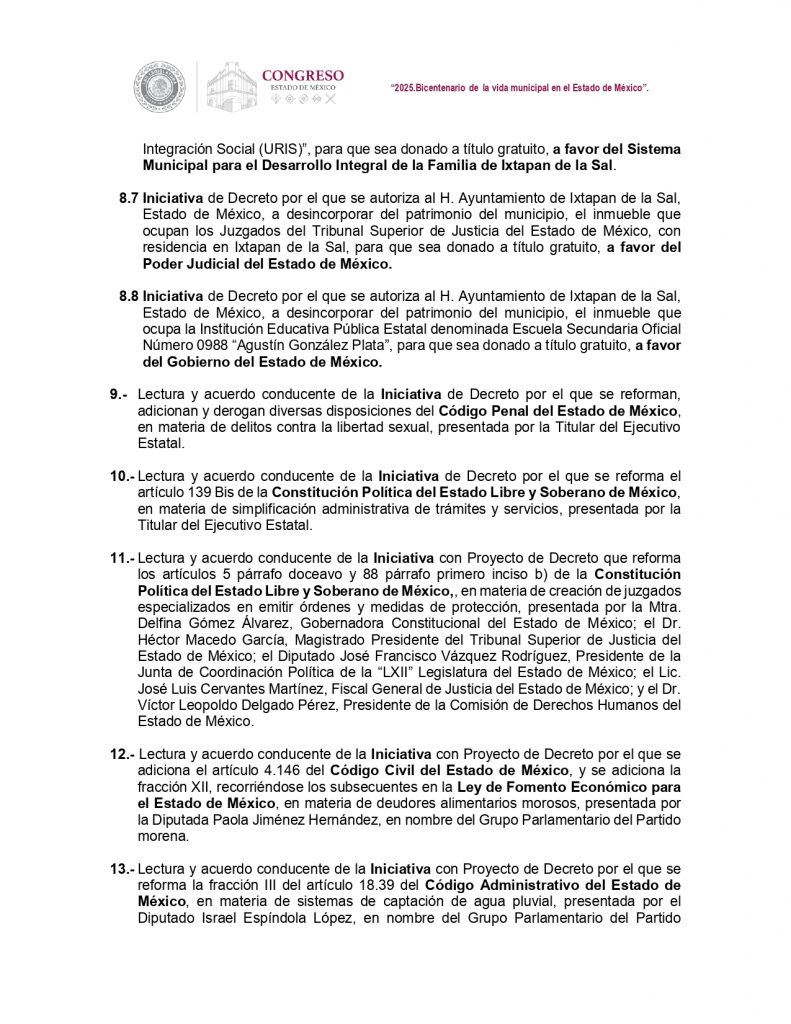 El pleno del Congreso también recibirá la iniciativa firmada por la gobernadora Delfina Gómez, el presidente del Poder Judicial, Héctor Macedo y el presidente de la Junta de Coordinación Política, Francisco Vázquez, en materia de creación de juzgados especializados en emitir órdenes y medidas de protección.
