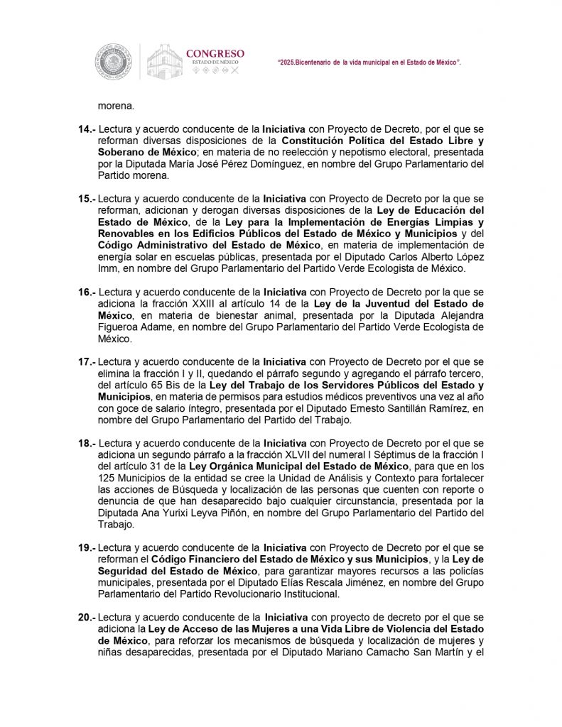 El Partido del Trabajo impulsará cambios a la Ley del Trabajo de los Servidores Públicos del Estado y Municipios, en materia de permisos para estudios médicos preventivos y otra iniciativa para reformar Ley Orgánica Municipal de la entidad para que los 125 municipios creen la Unidad de Análisis y Contexto para fortalecer las acciones de búsqueda y localización de las personas con reporte o denuncia de desaparición.