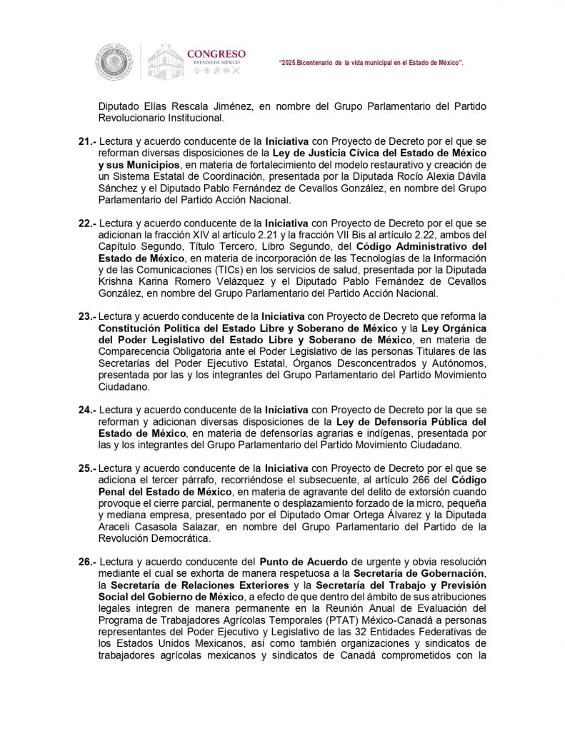 También planteará exhortar a las y los titulares de los 125 municipios a dar cumplimiento a los artículos tercero y cuarto transitorios de la Ley de Justicia Cívica de la entidad.