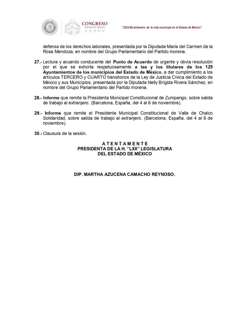 Finalmente, el Congreso recibirá dos informes de alcaldes: uno de la presidenta municipal de Zumpango sobre salida al extranjero del 4 al 6 de noviembre a Barcelona España y otro del alcalde de Valle de Chalco sobre salida al extranjero del 4 al 6 de noviembre también a Barcelona España.