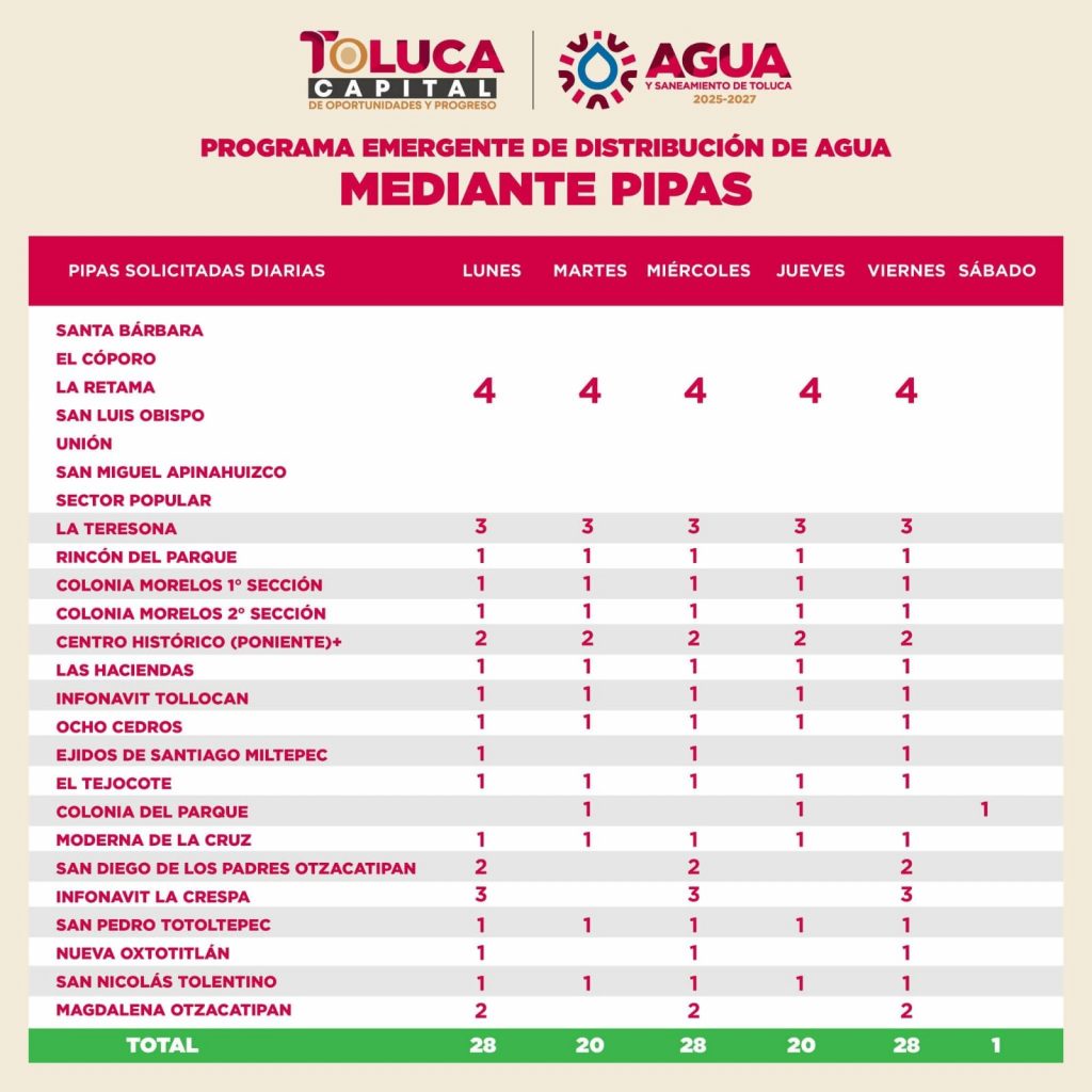 Para mitigar las afectaciones a la población durante el proceso, el Gobierno municipal a través del OAyST mantiene activo un programa emergente de distribución de agua mediante pipas. Además de las unidades que actualmente operan en las distintas colonias, se incorporaron siete pipas adicionales para fortalecer la atención y garantizar el abasto temporal. Las personas que requieran el servicio pueden solicitarlo al número telefónico 722 275 5700.