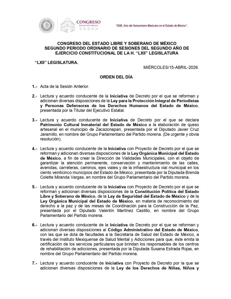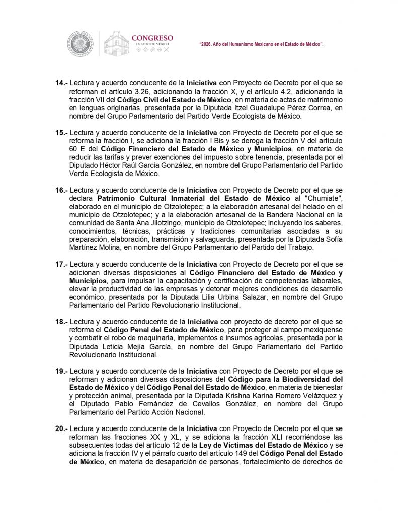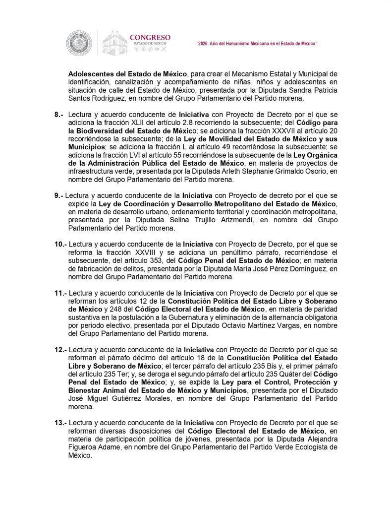 Entre los 24 puntos que se tienen en listados en la Orden del Día, hay 22 iniciativas de ley donde se abordan temas de mantenimiento, vialidades, certificación de anexos, atención a menores en situación de calle, infraestructura verde, frenar la fabricación de delitos, alternancia de género en la gubernatura, bienestar animal, participación electoral entre otros temas.