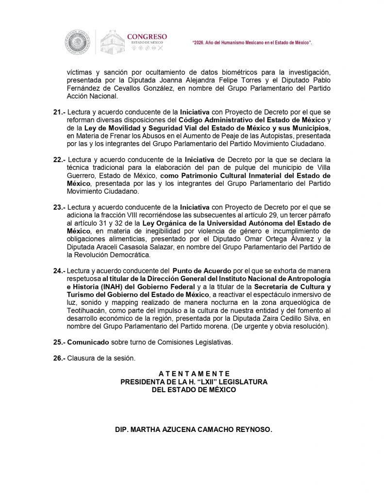 Durante la sesión se tiene contemplado un punto de acuerdo para exhortar a la Dirección General del Instituto Nacional de Antropología e Historia del Gobierno Federal y a la titular de la Secretaría de Cultura y Turismo para reactivar el espectáculo inmersivo de luz, sonido y mapping, realizado de manera nocturna en la zona arqueológica de Teotihuacán, como parte del impulso a la cultura de la entidad y fomento al desarrollo económico de la región.