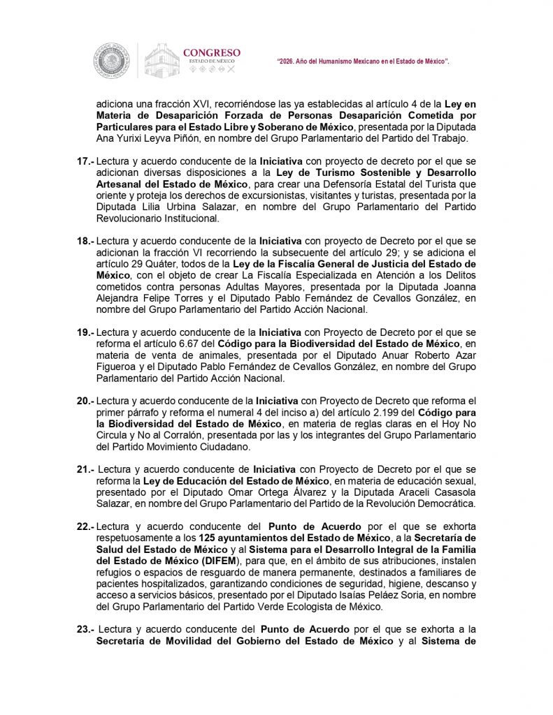 En tanto, Acción Nacional buscará hacer ajustes a la Ley de las Personas Adultas Mayores del Estado de México para promover la educación financiera en adultos mayores; Movimiento Ciudadano impulsará reformar la Ley de Educación respecto a uniformes neutros y el PRD hacer cambios al Código para la Biodiversidad en materia de protección y bienestar animal.