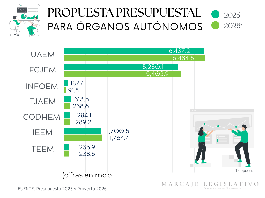 La propuesta presupuestal para el ejercicio fiscal 2026 contempla un monto total de 14 mil 595.2 millones de pesos para los siete órganos autónomos del Estado de México. En todos los casos se considera un aumento con excepción del Tribunal de Justicia Administrativa (Trijaem), a quien pretenden asignarle 74.9 millones de pesos menos, que representan un recorte de casi 24 puntos porcentuales.