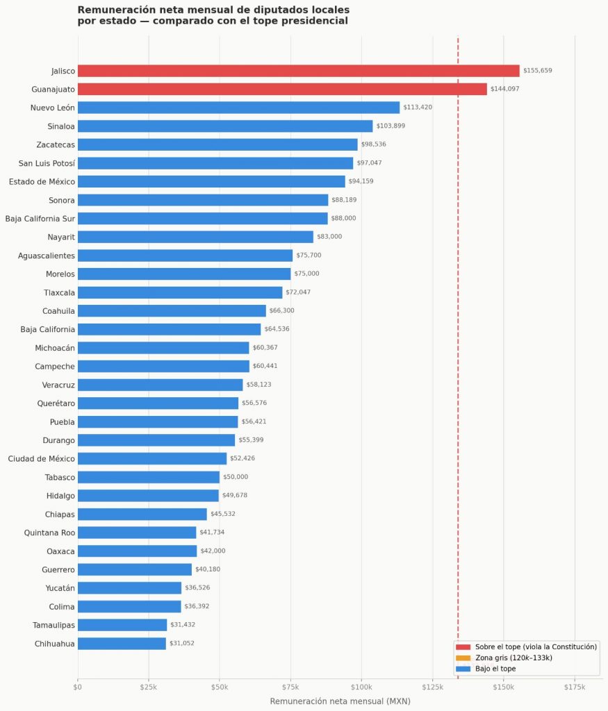 La brecha entre los sueldos más altos y más bajos fue significativa. Un diputado de Jalisco ganó cinco veces más que uno de Chihuahua. La diferencia absoluta superó los 124 mil pesos mensuales.