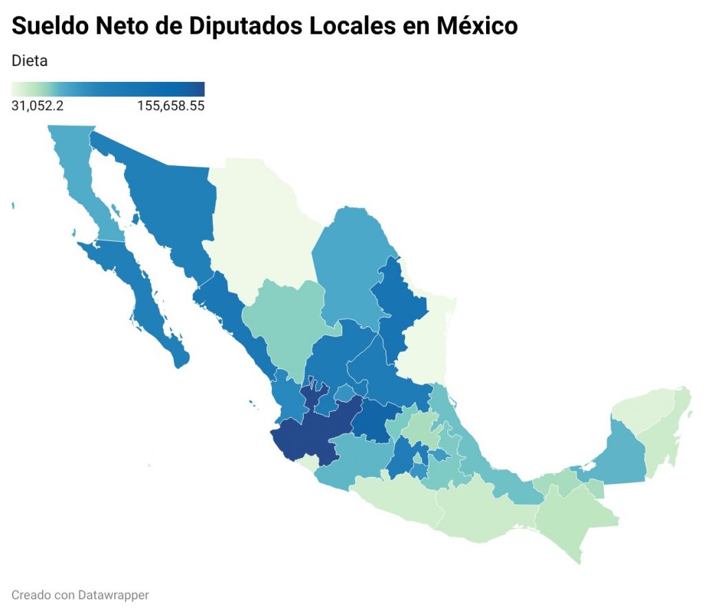 Estos niveles salariales representan menos de la mitad del ingreso promedio nacional de los diputados locales.