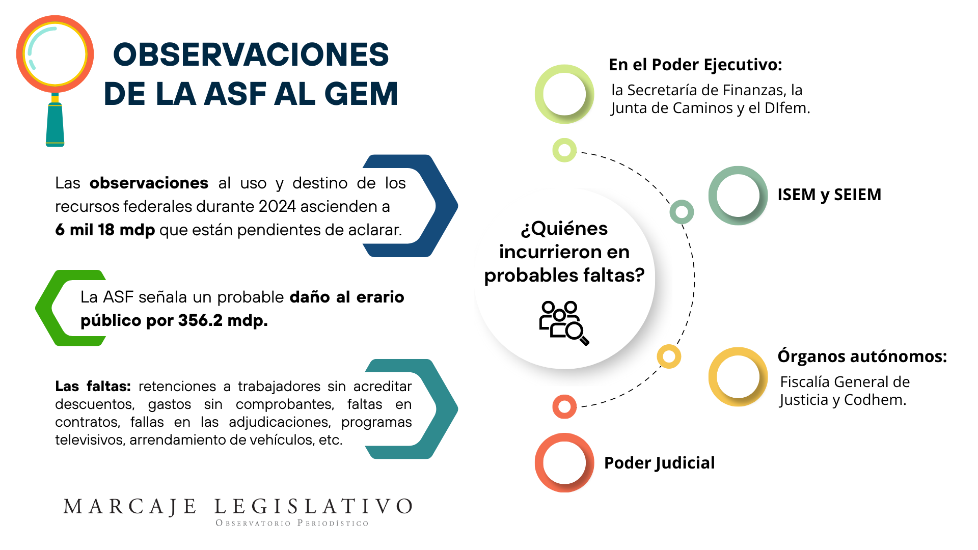 La Auditoría Superior de la Federación (ASF) observó más de 6 mil 18 millones de pesos en el manejo de recursos federales que hicieron diversas instancias al recurso federal que recibió el Gobierno del Estado de México durante 2024, donde se incluyen organismos descentralizados, órganos autónomos, el Poder Judicial y dependencias del Poder Ejecutivo.