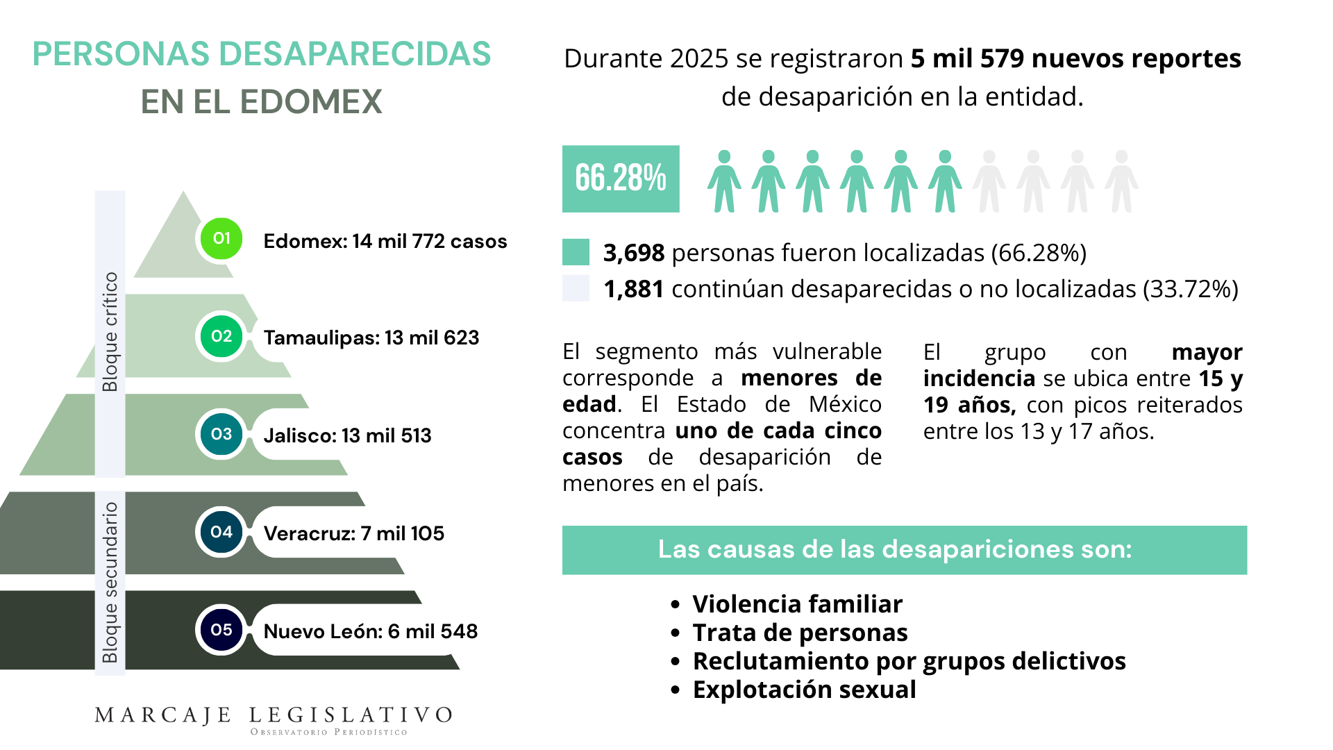 De acuerdo con el Programa de Protección de Niñas, Niños y Adolescentes del Estado de México (PROEPINNA) 2025–2029 se reconoce que al menos 3,890 personas desaparecidas en la entidad son menores de edad. El documento identifica factores de riesgo como: