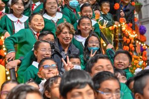Más tarde, recibió y saludó a las y los estudiantes que visitaron en Palacio de Gobierno la Ofrenda Monumental de Día de Muertos.