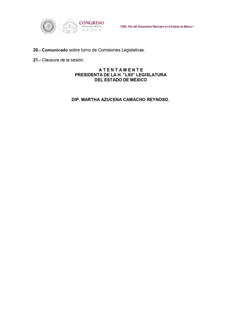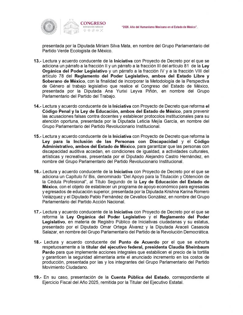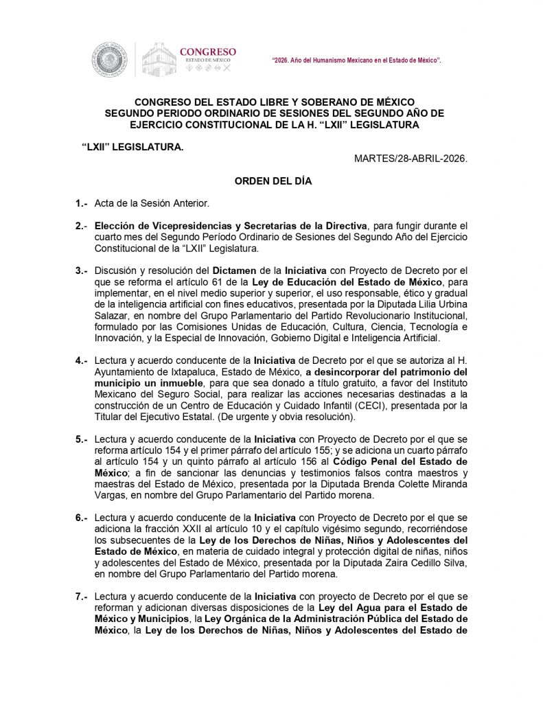 Finalmente, el pleno recibirá la Cuenta Pública del Estado de México del ejercicio fiscal 2025, que será entregada este martes 28 de abril, por el secretario de Finanzas Oscar Flores.