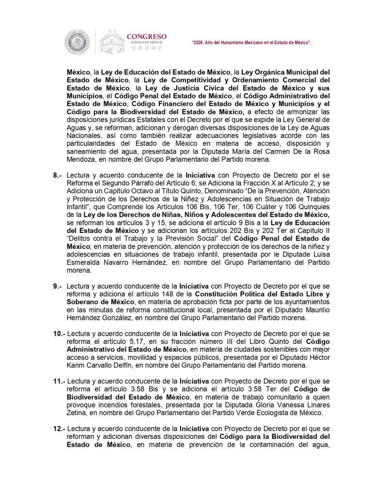 Además, morena propondrá reformar el Código Penal para sancionar las denuncias y testimonios falsos contra maestras y maestros del Estado de México y ajustes a la Ley de los Derechos de Niñas, Niños y Adolescentes, en materia de Cuidado Integral y Protección Digital, así como una propuesta para armonizar las disposiciones jurídicas en materia de agua.