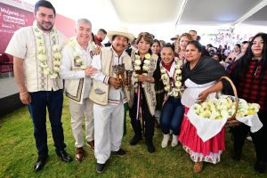 Más tarde, en el norte de la entidad, en el municipio de Aculco hizo entrega de apoyos de los programas Mujeres con Bienestar, Servir para el Bienestar y Alimentación para el Bienestar.