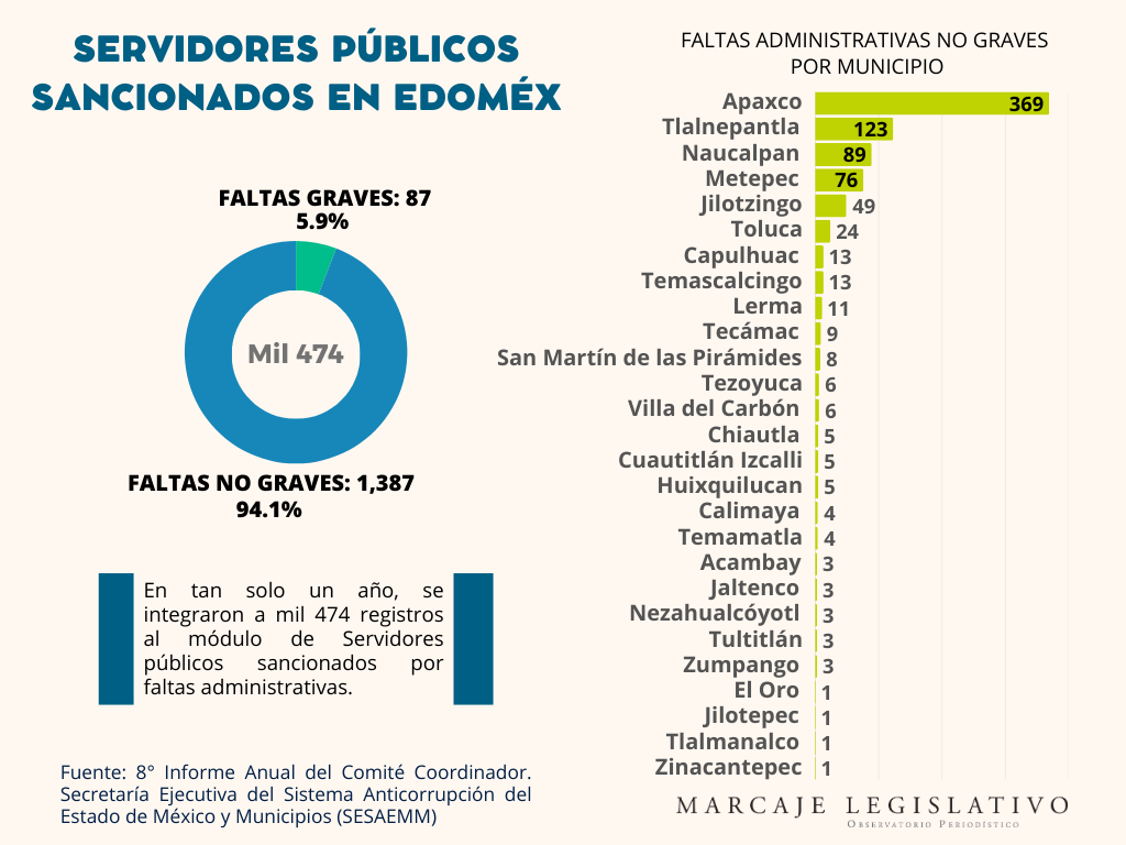 Apaxco es el municipio que registra el mayor número de faltas administrativas no graves, con 369 casos; seguido por Tlalnepantla con 123; Naucalpan con 89; Metepec con 76; Jilotzingo con 49; Toluca con 24; Capulhuac y Temascalcingo con 13; Lerma con 11 y Tecámac con 9.