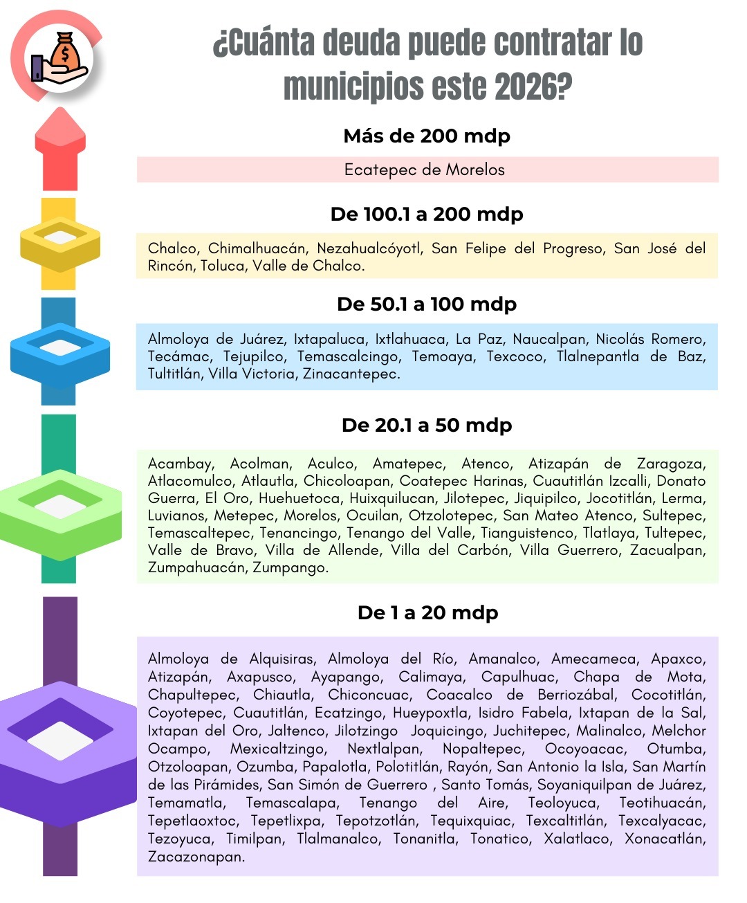 Entre los municipios con los importes menores para contratar deuda están los casos de Almoloya del Río con 5. 7 millones de pesos, Atizapán 5. 5, Ayapango 5. 9, Cocotitlán 4. 6, Chapultepec 3.7, Mexicaltzingo 3.8, Papalotla 3.7, Temamatla 4.1, Tenango del Aire 5.3 y Tonatitla 4.2 millones de pesos.
