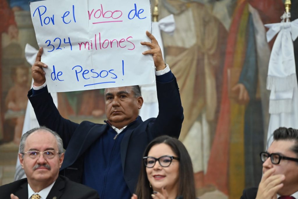 En esa ocasión, en pleno informe, el legislador de morena se colocó atrás de los invitados en el presidium, donde se encontraba el titular del TRIJAEM, Gerardo Becker Ania, y mostró dos cartulinas para cuestionar la falta de sanción por el presunto robo de más de 32 millones de pesos en el Tribunal. En una cartulina decía “Falta castigo a los delincuentes de cuello blanco del Trijaem” y en la segunda “Por el robo de 32.4 millones de pesos”.
