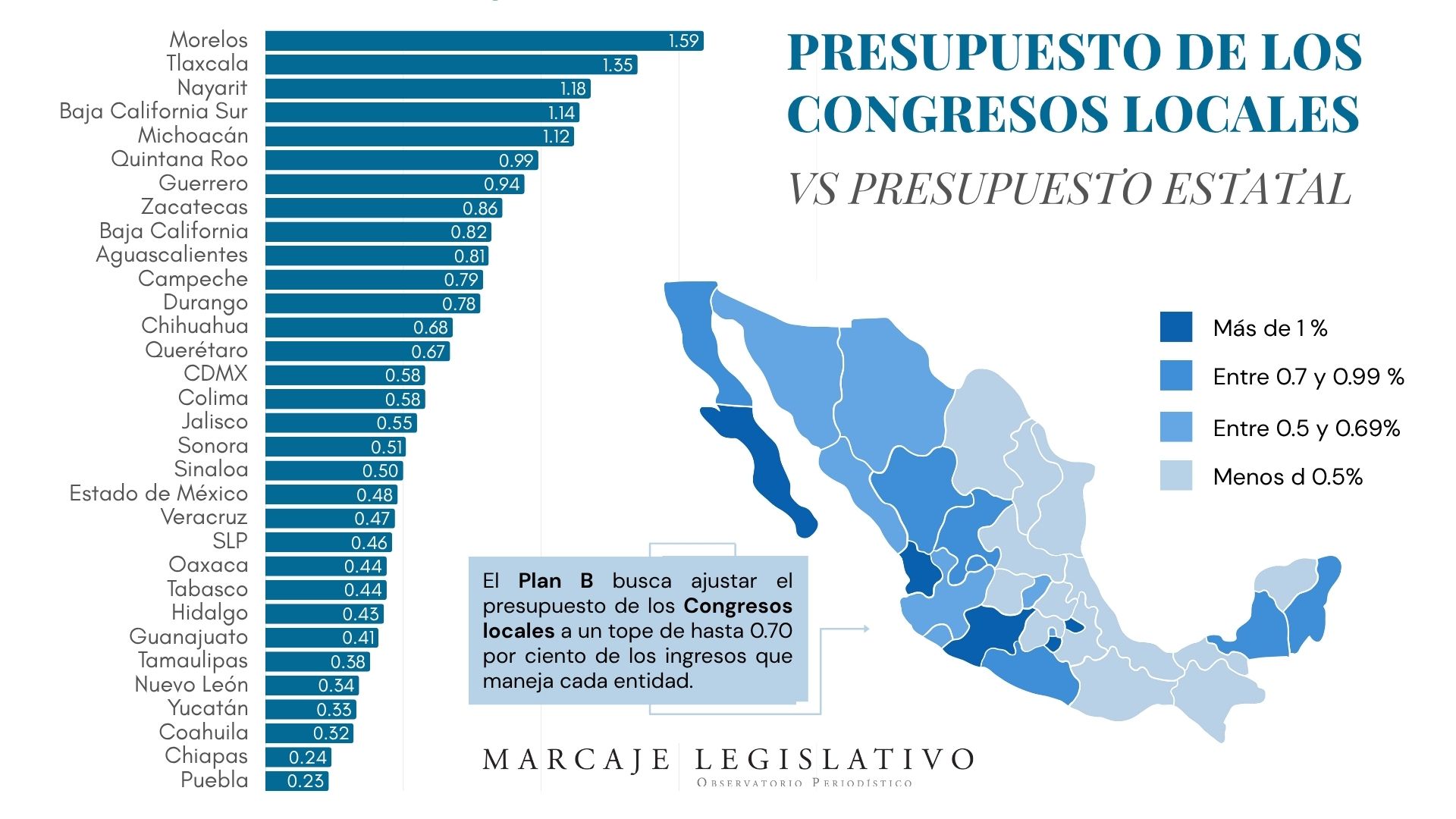 Los Congresos locales que este año manejan un presupuesto arriba del porcentaje antes señalado son: Baja California, Morelos, Michoacán, Quintana Roo, Guerrero, Tlaxcala, Durango, Baja California Sur, Nayarit, Zacatecas, Aguascalientes y Campeche: el resto del país está dentro de la medida.