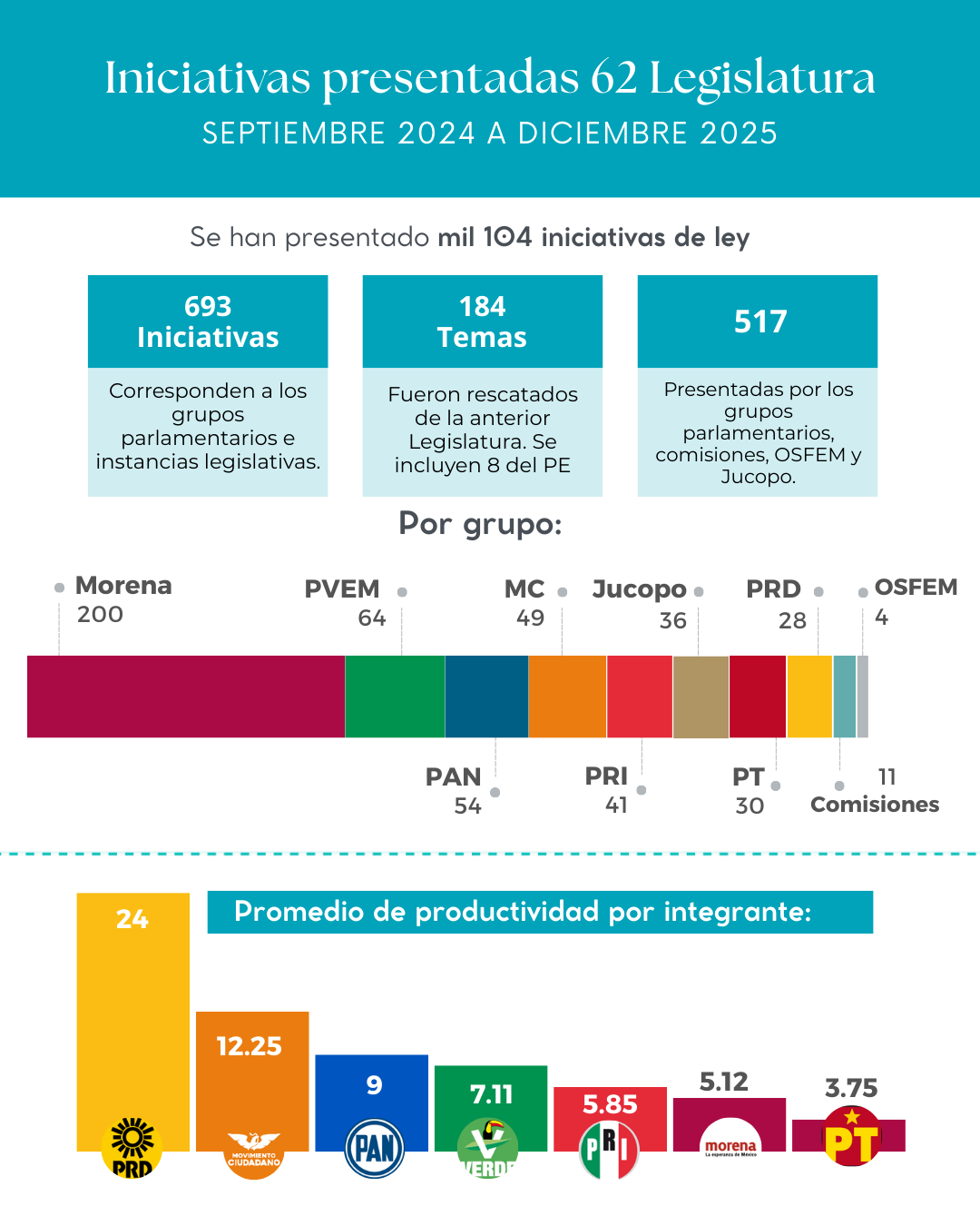 El total de temas ingresados en esta Legislatura, por las, los y le diputade, así como por la Junta de Coordinación Política o diferentes grupos parlamentarios, las comisiones legislativas o el Órgano Superior de Fiscalización asciende a 517 temas, donde Morena se ubicó a la cabeza con 200 propuestas.