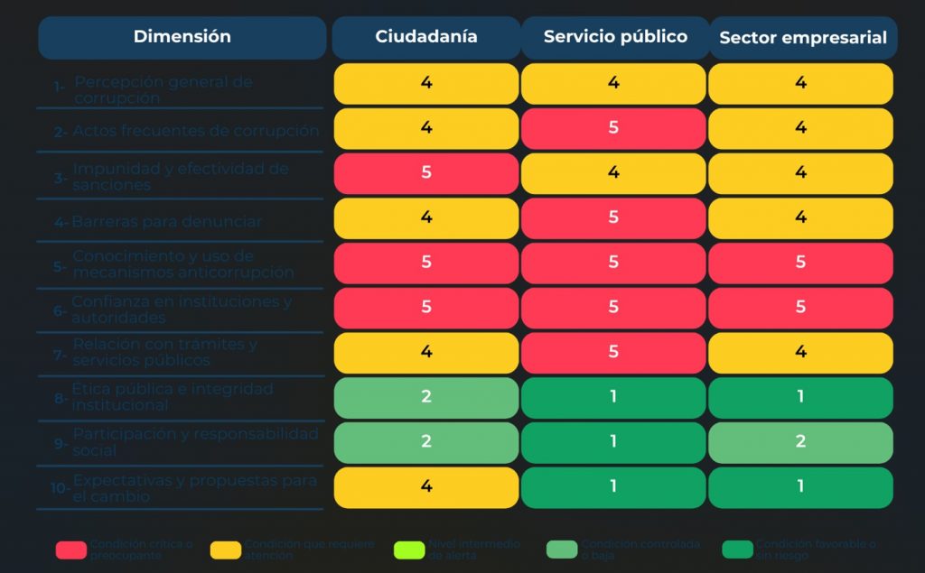 El diagnóstico se organizó en 10 dimensiones donde se midió la percepción general de la corrupción que tienen estos tres sectores, los actos frecuentes de corrupción, la impunidad y efectividad de sanciones, las barreras para denunciar, el conocimiento de mecanismos anticorrupción, la confianza en instituciones y autoridades, la relación con trámites y servicios, la ética pública e integridad institucional, la participación y responsabilidad social y las expectativas y propuestas del cambio.