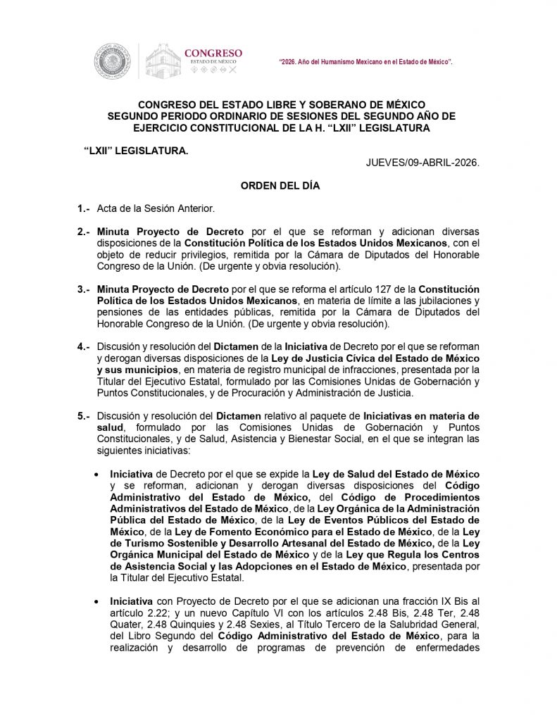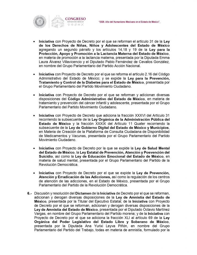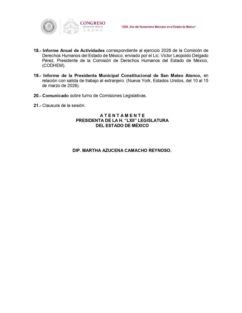La Legislatura también recibirá el informe anual de actividades de la Comisión de Derechos Humanos, un informe de la presidenta municipal de San Mateo Atenco, con relación a una salida al trabajo al extranjero, específicamente a Nueva York, Estados Unidos del 10 al 15 de marzo.