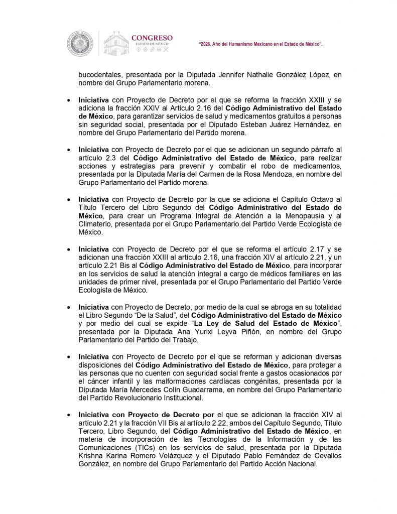 Este jueves el Congreso del Estado de México expedirá la Ley de Salud de la entidad, con el objetivo de regular los servicios, garantizar el derecho de la población a la atención médica, definir las responsabilidades de las autoridades, fortalecer la coordinación institucional y reconocer los derechos de las personas usuarias y las pacientes.
