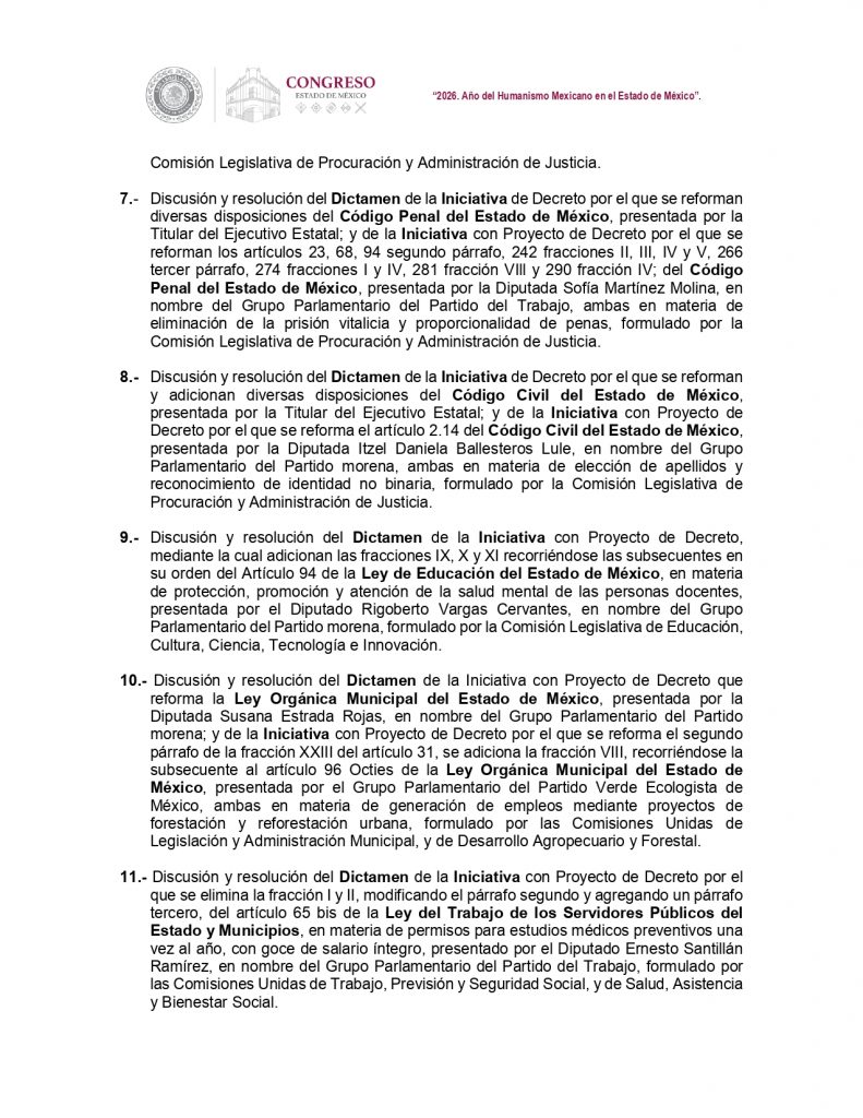El pleno votará además el dictamen de reformas al Código Penal en materia de eliminación de la prisión vitalicia y proporcionalidad de las penas, y otro para ajustar el Código Civil estatal en materia de elección de apellidos y reconocimiento de identidad no binaria.