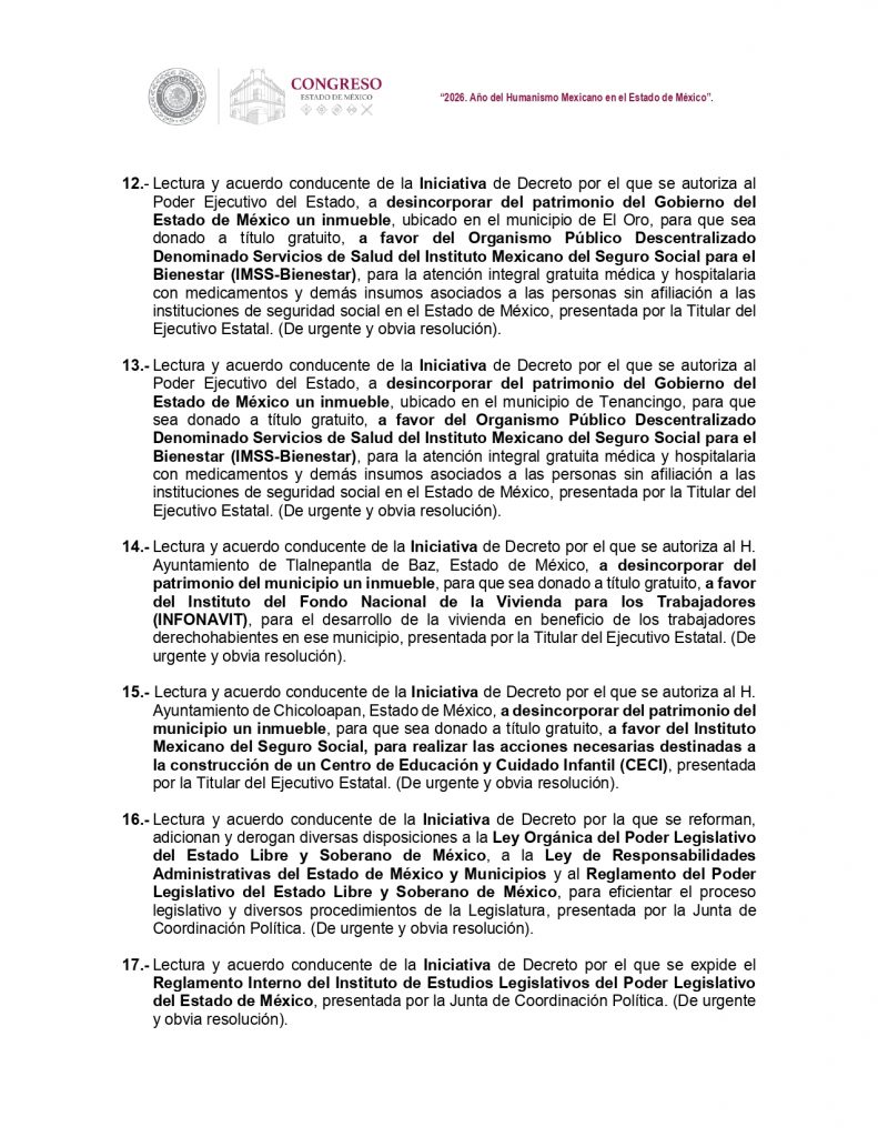 Una tercera propuesta será para autorizar al ayuntamiento de Tlalnepantla a desincorporar un inmueble para donarlo al Infonavit, y otra más para que el ayuntamiento de Chicoloapan desincorpore un inmueble y lo done al Instituto Mexicano del Seguro Social para construir un Centro de Educación y Cuidado Infantil (CECI).