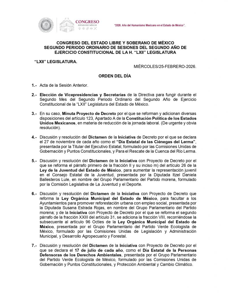 Se tienen contemplados cuatro dictámenes de las comisiones legislativas, donde sobresale la declaración del 27 de noviembre de cada año como el Día Estatal de las Ciénegas del Lerma, que presentó la titular del Ejecutivo, para fortalecer las acciones en este tema.